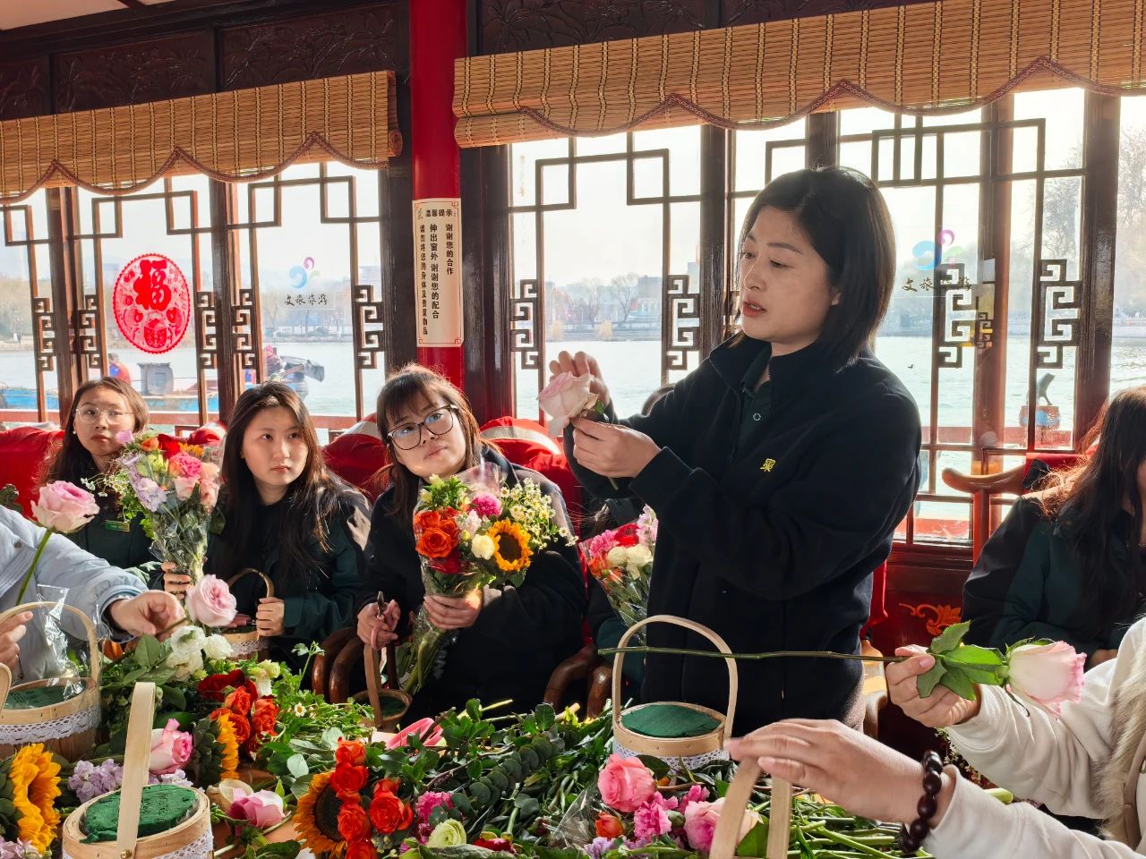 三月芳菲,春風(fēng)拂面,大明湖上,煙波浩渺。三十余名女職工在乘坐畫(huà)舫游湖的過(guò)程中體驗(yàn)插花藝術(shù)。在專業(yè)花藝師--百合園林集團(tuán)花卉市場(chǎng)分公司負(fù)責(zé)人王鈞花的指導(dǎo)下,大家精心設(shè)計(jì)、巧手修剪,將各色花卉巧妙搭配,創(chuàng)作出一件件獨(dú)具匠心的插花作品。